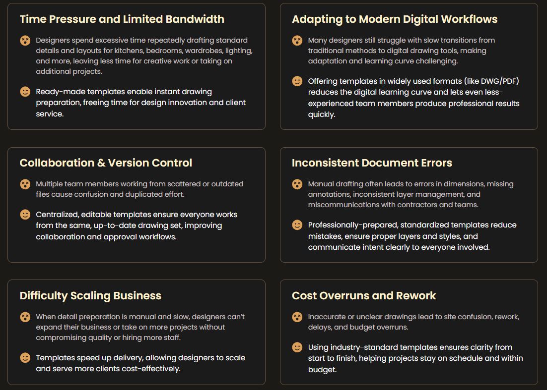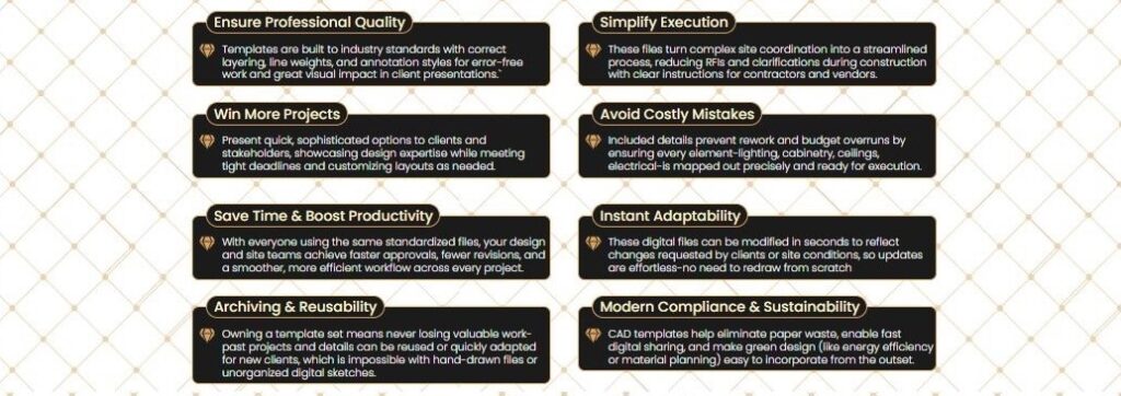Streamline every phase of your interior design projects with editable, industry-standard resources that save you hours of drafting time.