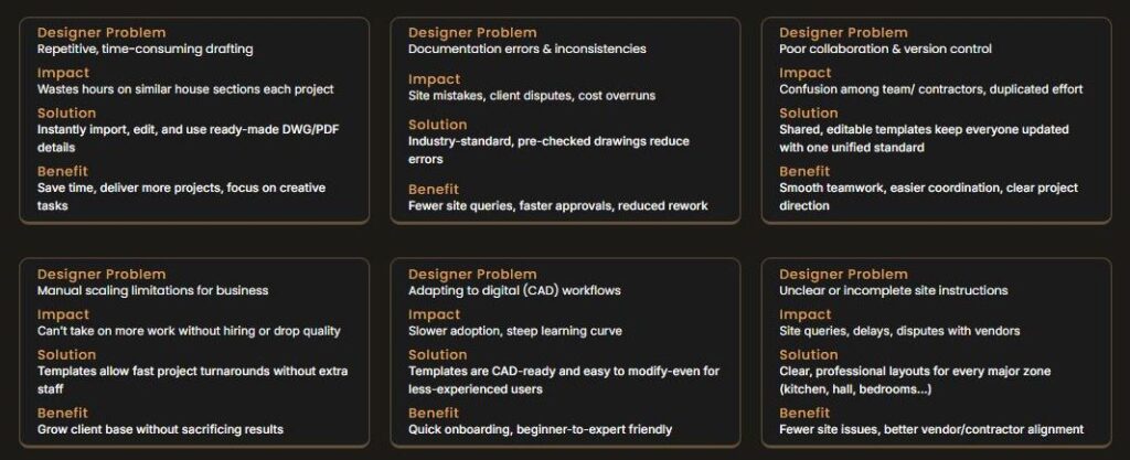 You’ll receive a complete library of editable DWG and PDF templates for all major interior sections-drawing rooms, kitchens, bedrooms, wardrobes, ceilings, lighting layouts, mandirs, and more. Each is fully editable, standardized, and ready for immediate use in professional projects.